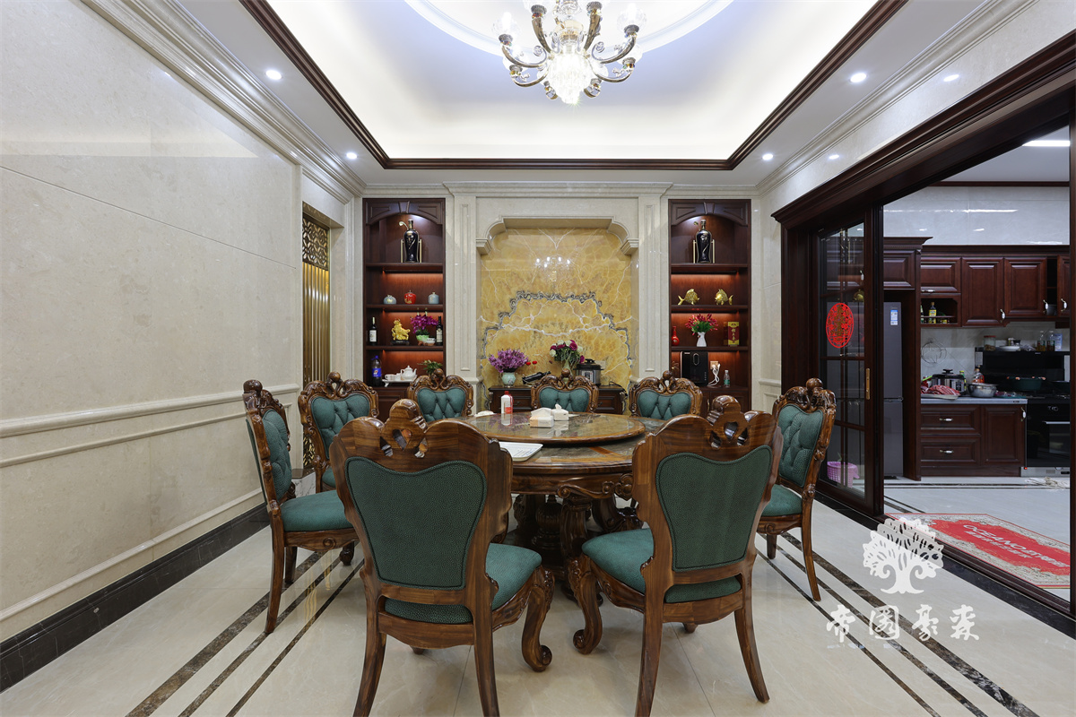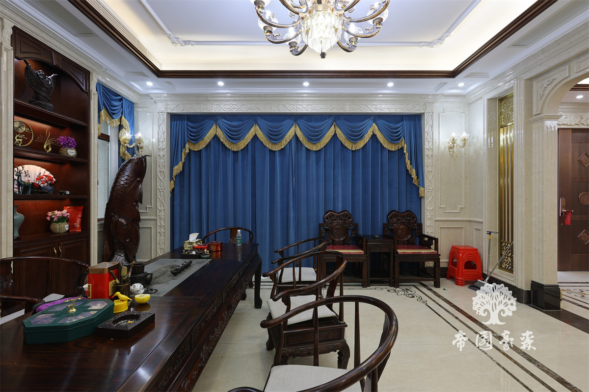 水晶灯的光线及软装深绿色系窗帘,