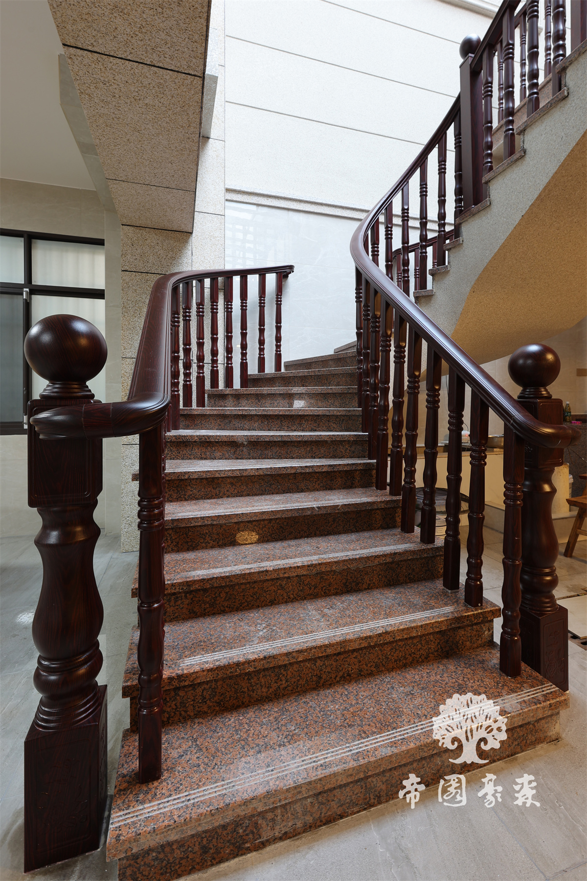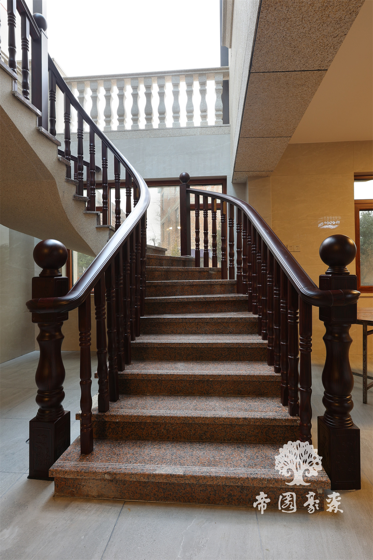 通往二楼的旋转楼梯,实木扶手围栏,罗马柱的造型,大理石搭建的台阶,缔造空间的气势与华美。