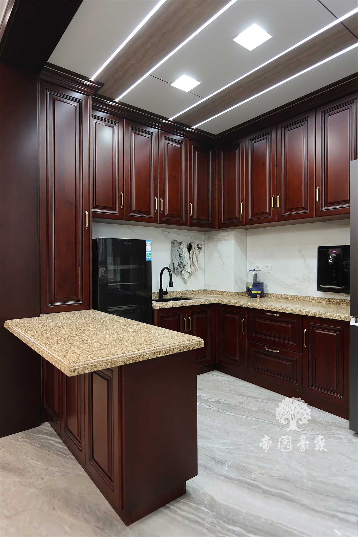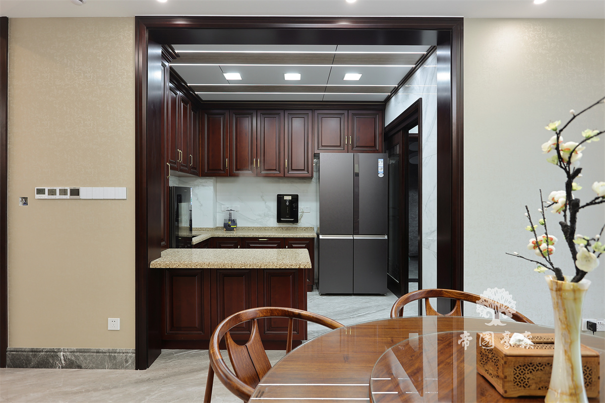 使用高吊柜柜体设计的开放式厨房,使得整个空间更加宽敞,清冷质感的石英石和温润质感的实木搭配,视觉上更为跳跃,传统中透着现代,现代中糅合着古典,美得让人心旷神怡。
