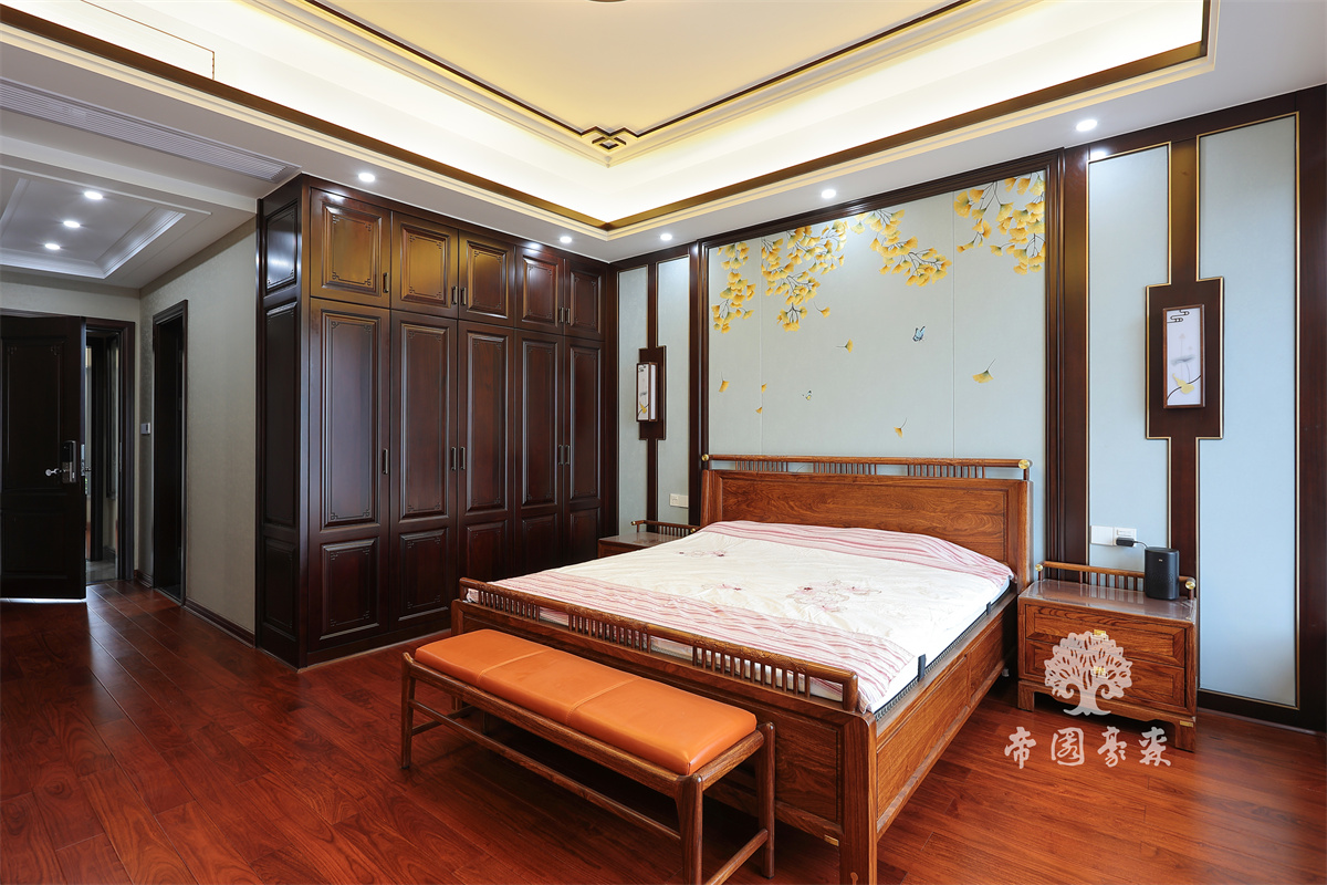 利用整面墙体来设计衣柜,还带有古典味道的顶线和造型,在中式装修风格中,家具的选择十分重要,现代人往往沉醉于新中式家具那简单质朴之美。