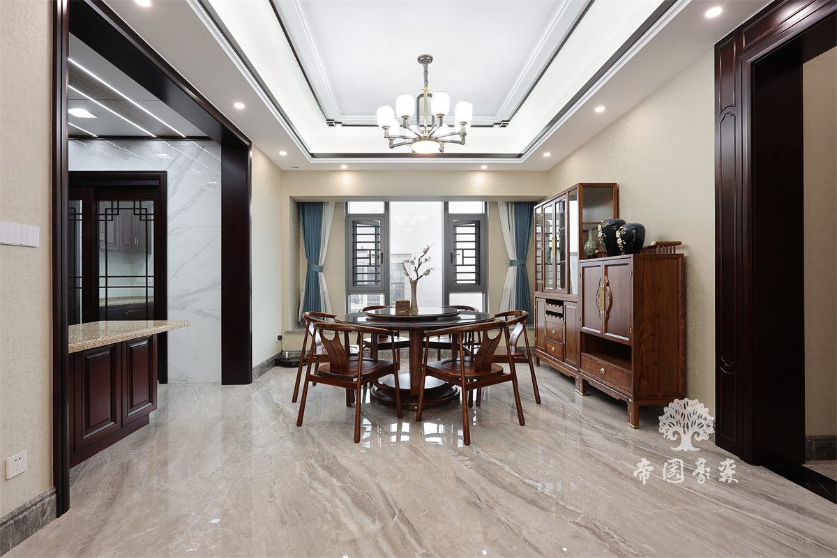 客餐厅设计时尚而沉稳,既营造了一种古色古香的风雅意境,又无形之中凸显了主人的文化涵养与优雅气质,其本身独具一格的现代新中式概念,对餐厅与客厅做了功能性划分,圆形餐桌视觉与实用性强大。