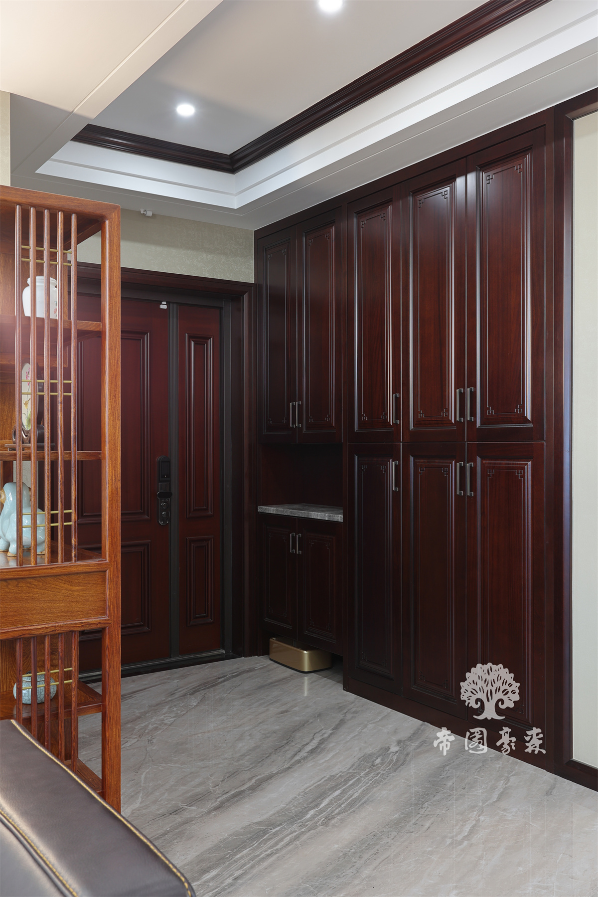 新中式风格的玄关的设计是比较简练的,但是无不体现着高端大气,整体空间开阔。