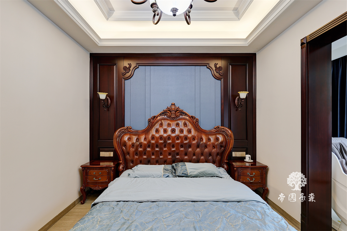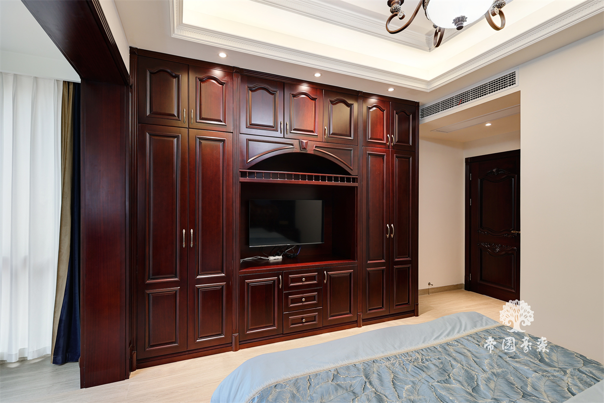 深色木质衣柜堪称「空间魔术师」——古典装饰线条贯穿全身,中间开放格既能摆香薰又能放书籍,与白色窗纱的轻盈形成反差;柜门的雕花与木门如出一辙,连地板的浅色木纹都在配合,让整个空间「深而不沉」。