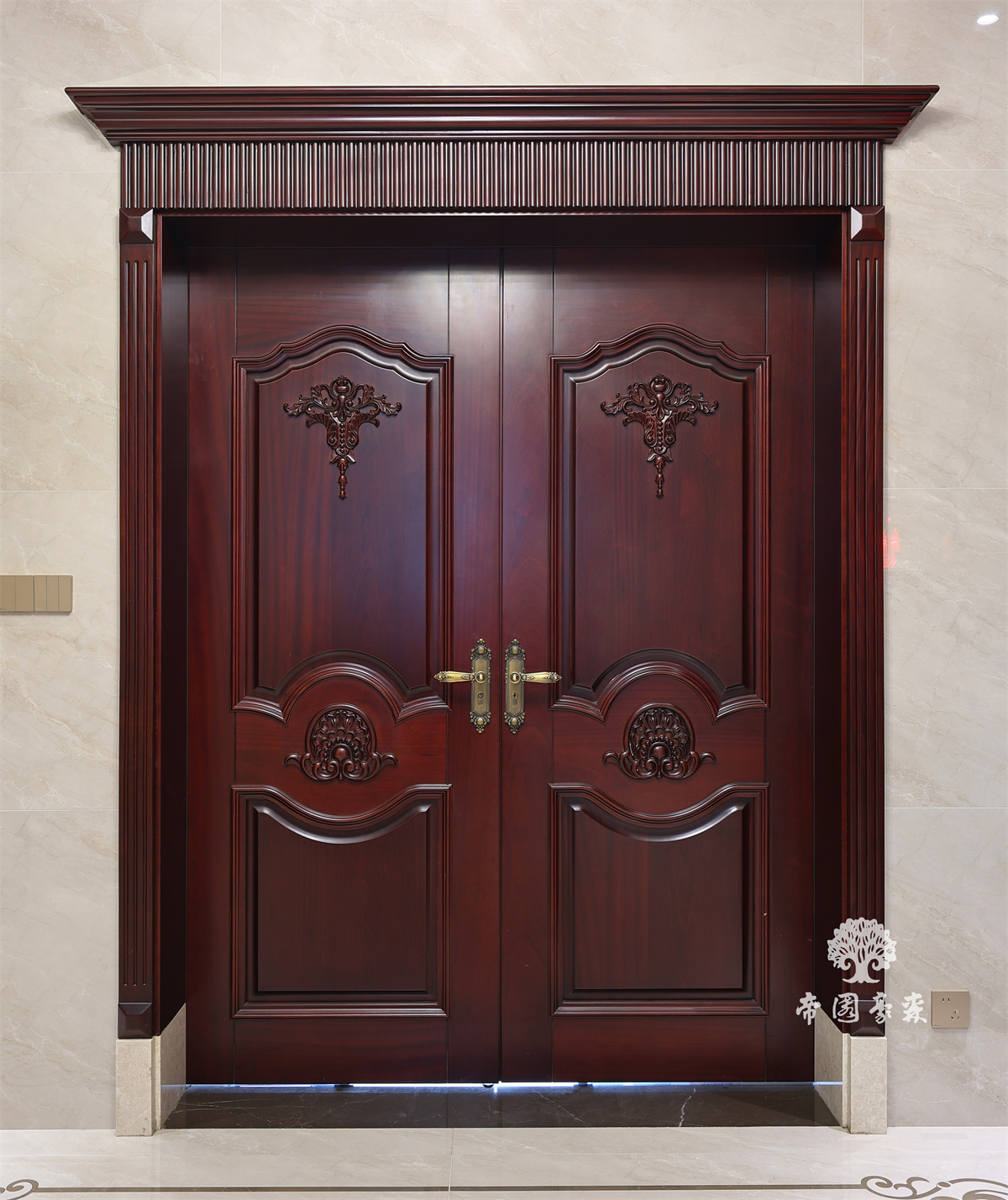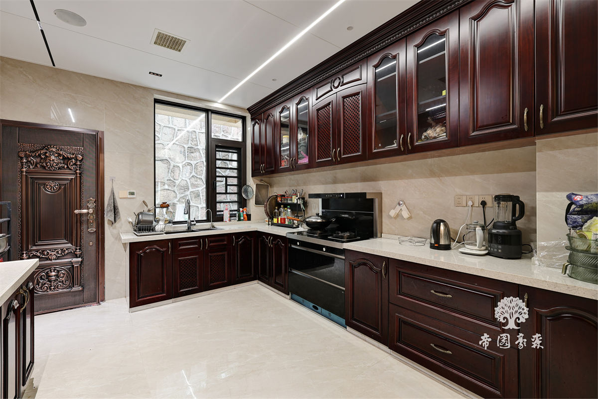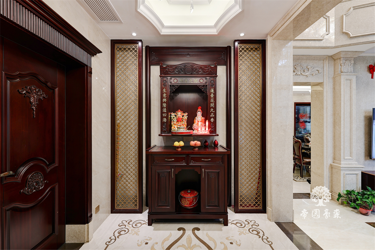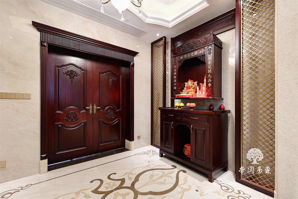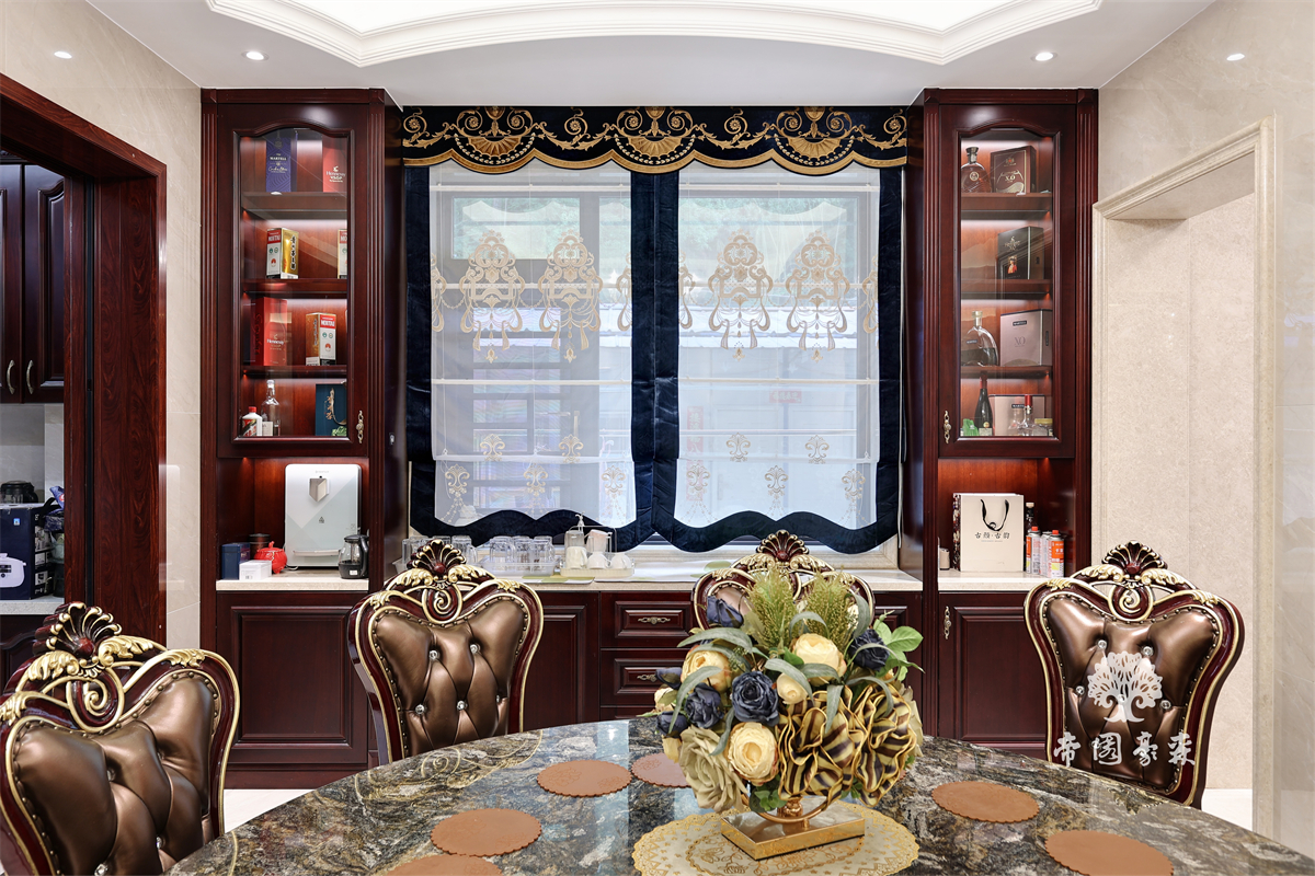 全屋以深色原木为基底,从门廊到橱柜,从雕花桌椅到酒柜,每一处都带着时光沉淀的温润感。进门的神龛设计,深木色柜体搭配细腻雕花,庄重中藏着传统温度;餐厅区域,雕花原木椅与大理石餐桌相映成趣,复古与精致碰撞出独特气质;酒柜则是巧思所在——既能收纳美酒,又能展示珍藏,实用与美观兼修。