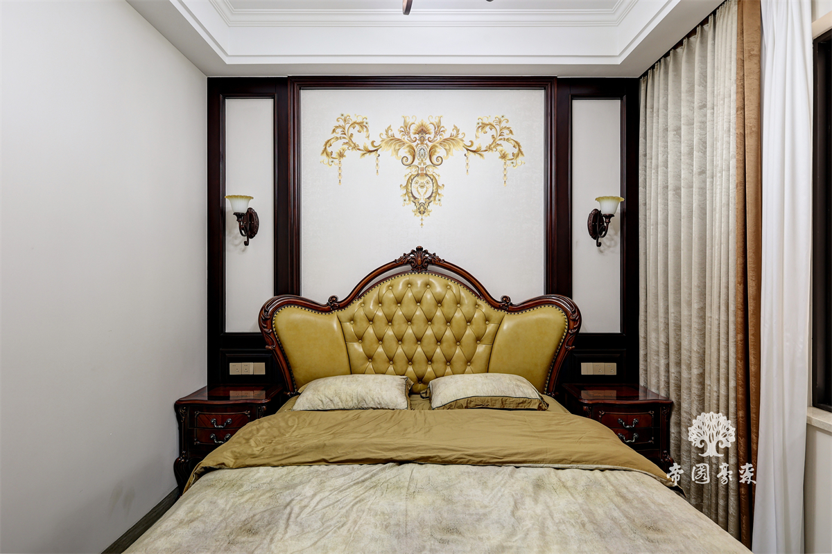 推开门的瞬间,目光便被床头背景墙「拽」住——那是一面用线条与色彩写就的「古典诗」,连空气都染上了鎏金的温柔。