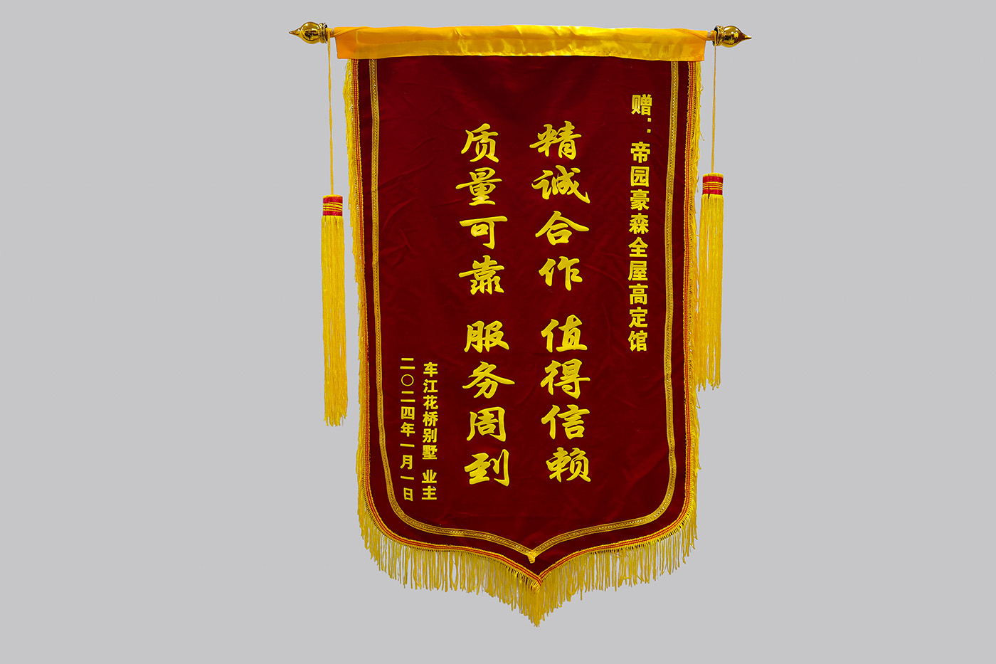 感谢车江花桥别墅业主赠送锦旗。精诚合作、值得信赖;质量可靠,服务周到,这是对我们最大的肯定。帝园豪森将一如既往提供优质服务,因木结缘,以品交心,交由我们,所以您放心。