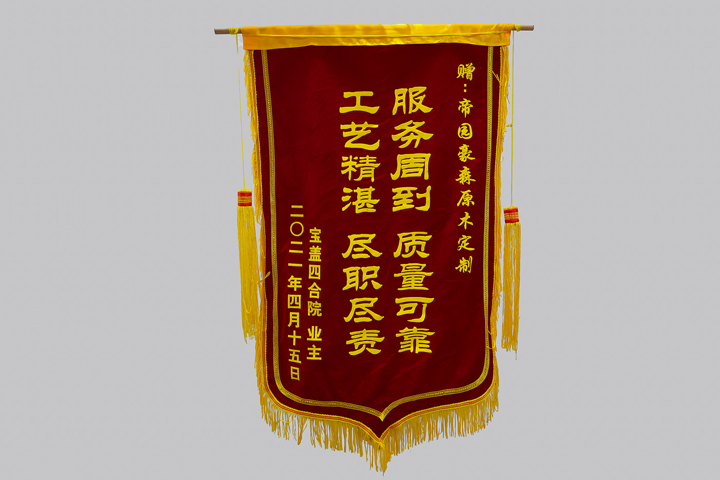 感谢宝盖四合院业主赠送锦旗。服务周到、质量可靠;工艺精湛,尽职尽责,这是对我们最大的肯定。帝园豪森将一如既往提供优质服务。因木结缘,以品交心,交由我们,所以您放心。